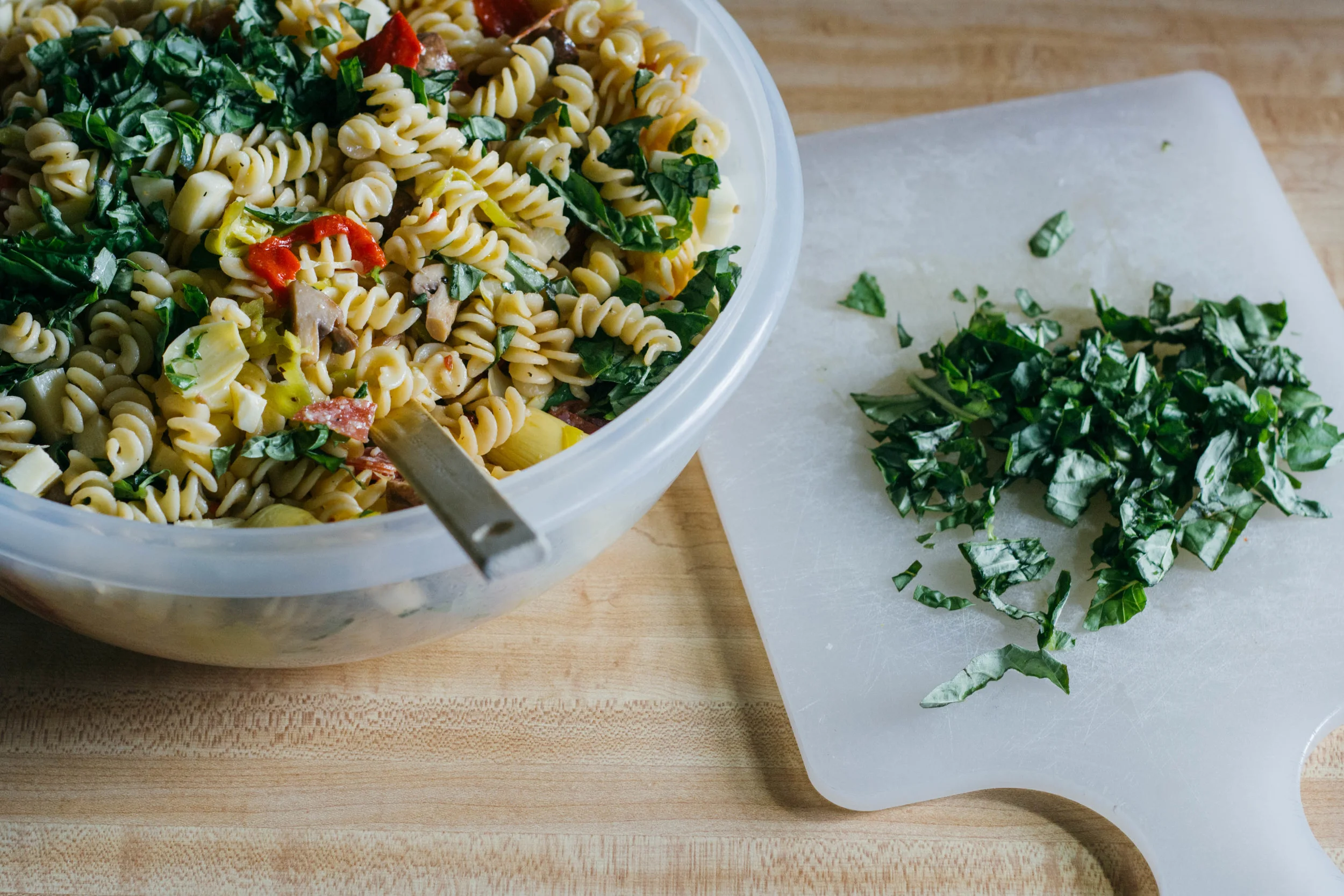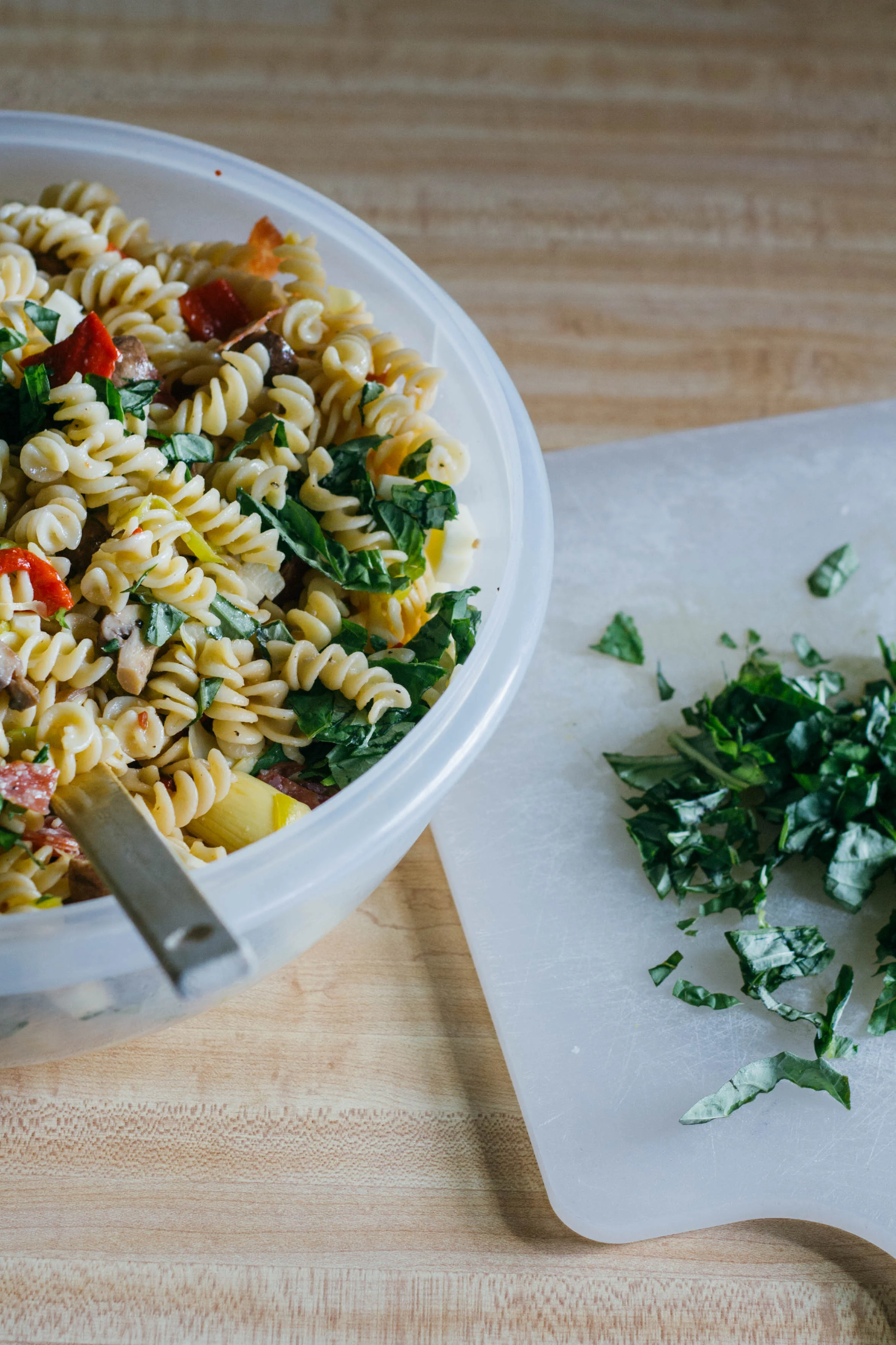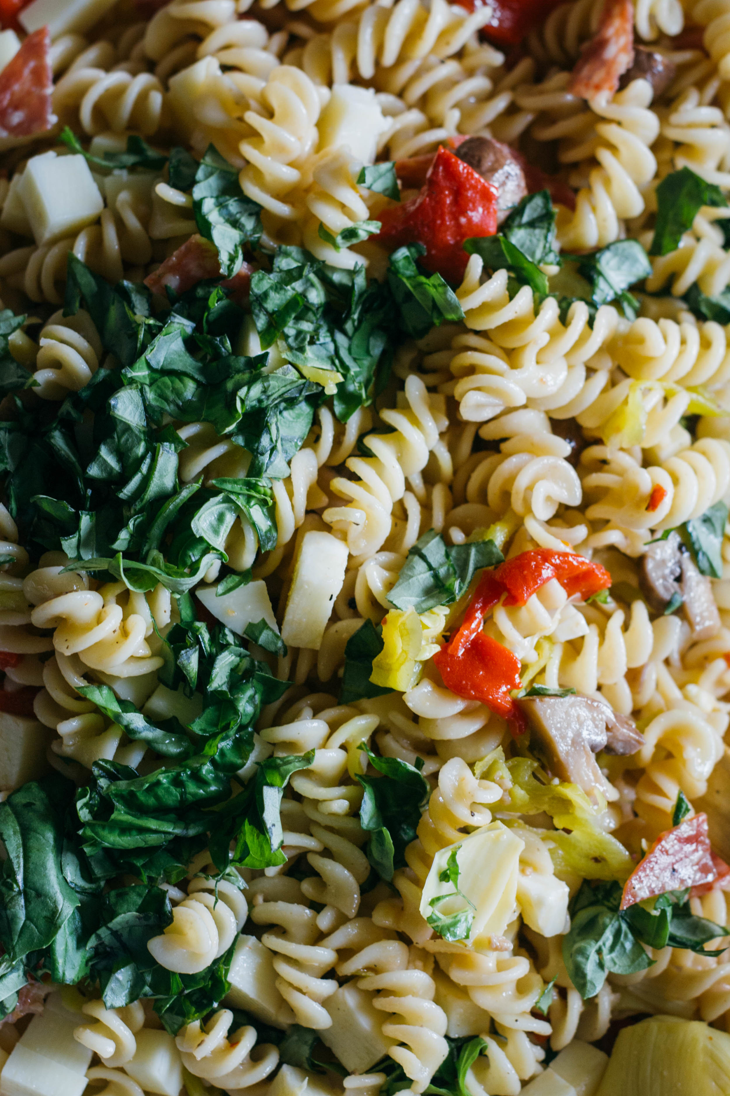 Transfer the cooled pasta to a large bowl or container and pour the mushrooms (and all of the liquid!) over the top. Add the pepperoncini, salami, mozzarella, roasted peppers, artichoke hearts, and basil, and toss to combine. Taste again for salt and pepper before serving.