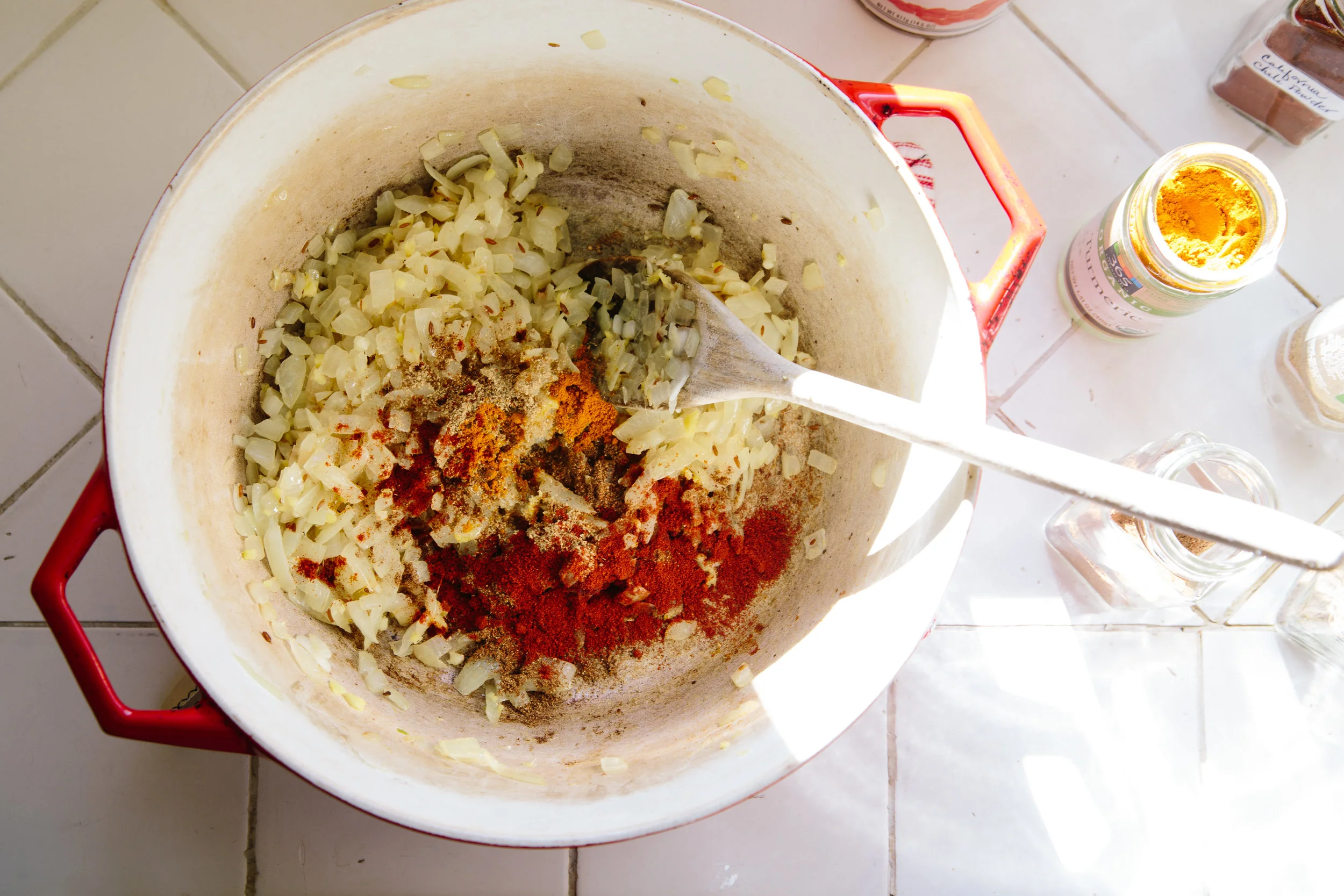 In a medium pot (I like to use my dutch oven) over medium heat, heat the oil. Add the onion and cumin seeds and sauté until lightly browned. Stir in the garlic and ginger, sautéing for about a minute, then stir in the coriander, turmeric, garam masala, and chile powder along with the can of tomatoes. Cook for a few more minutes, stirring often and scraping up any bits on the bottom of the pot. The mixture will darken slightly and become tighter.