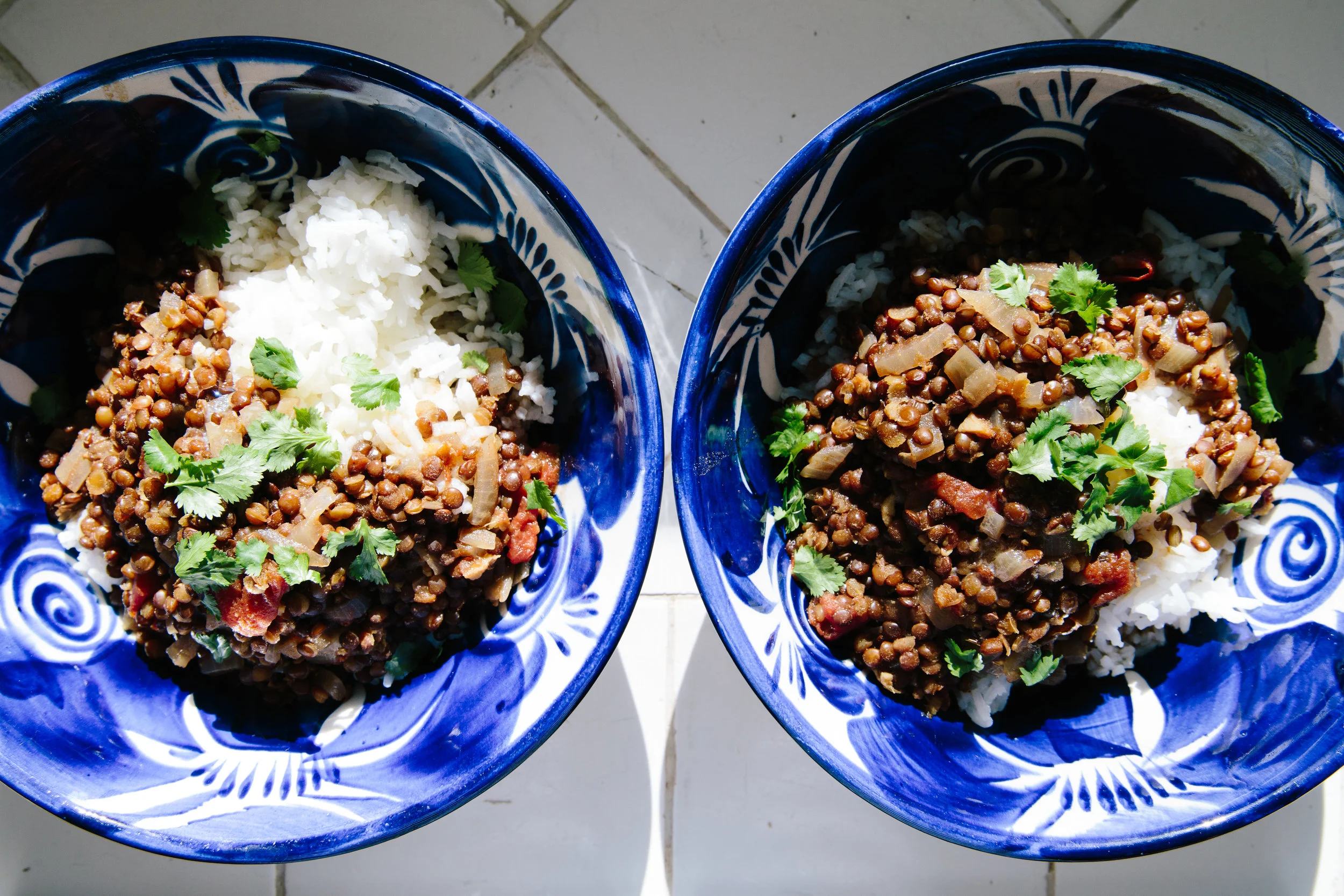 To serve, scoop the lentils into bowls over rice. Top with a small amount of butter and cream, and sprinkle fresh cilantro.